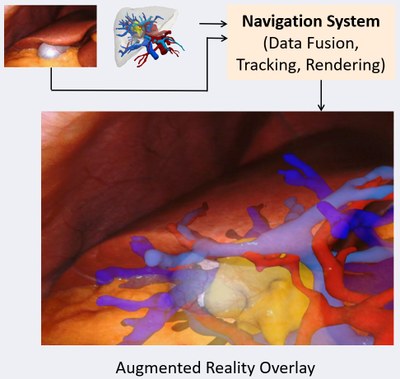 The purpose of intraoperative navigation is to provide the surgeon with real-time information about the location of critical structures, such as blood vessels and nerves, as well as the tumor itself. This information is based on preoperative planning data, such as CT or MRI scans of the patient's anatomy, and is overlaid with the surgeon's view of the surgical field using augmented reality (AR) technology. In soft-tissue navigation, for example in the case of liver surgery, the deformation of organs and tissues can be a significant challenge. This is due to the fact that the organs can shift and change shape during the procedure, making it difficult to accurately track their position in real time. Additionally, different patient poses and breathing patterns can also affect the accuracy of the navigation system.